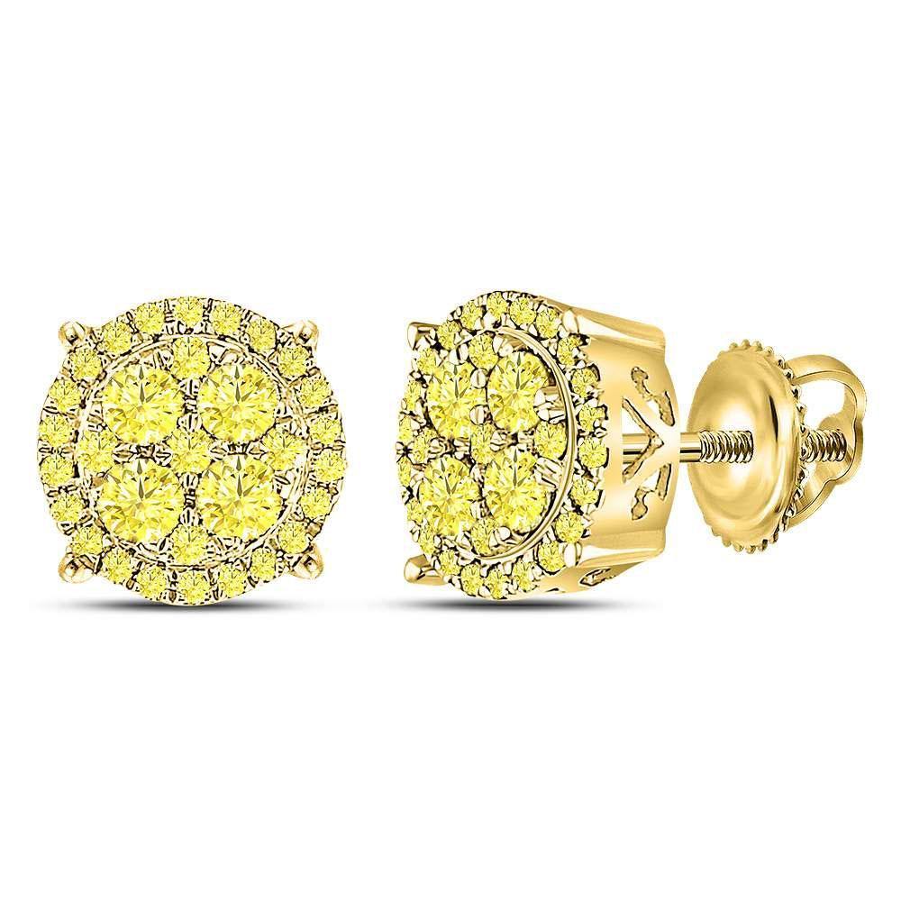 10kt Yellow Gold Womens Round Canary Diamond Cluster Stud Earrings 1.00 Cttw. | Combined diamond weight of 1.00 carats total weight represents a range of 0.95 - 1.17 cts. t.w. | All colored diamonds in this piece are treated to permanently alter their appearance.